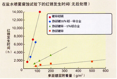 約7年的暴露結(jié)果表明,鍍鋅鋁鎂鋼板比熱浸鍍鋅鋼板的耐蝕性約高4倍。隨著時(shí)間的推移,鍍鋅鋁鎂鋼板比其他鍍層鋼板出現(xiàn)的腐蝕減量下降,因此鍍鋅鋁鎂鋼板與其他鍍層鋼板的耐蝕性差距將會(huì)進(jìn)一步拉大。