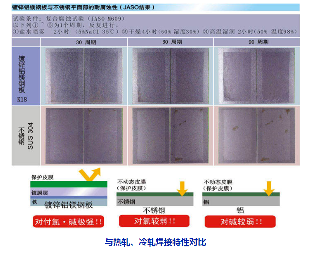 但作為面板表面等使用時(shí)的“耐紅銹性”,鍍鋅鋁鎂鋼板極為優(yōu)異。抗腐蝕非常強(qiáng)的鋁的耐腐蝕性,也是由其表層的不動(dòng)態(tài)皮膜所實(shí)現(xiàn)的。但是,鋁具有對(duì)“堿”較弱的性質(zhì)。